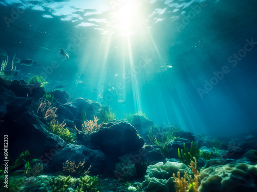 Fototapeta premium Ocean sunlight in the water, atmospheric environment, vibrant. Generative Ai Illustration.