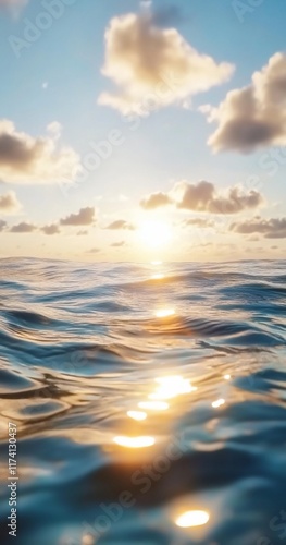 Fototapeta premium Ocean sunset, calm waves, golden light, cloudscape, travel