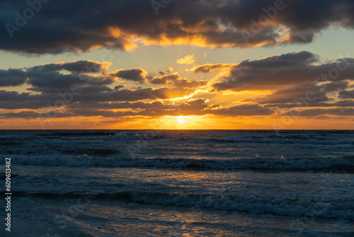© bilanol, Obraz premium Ocean sunset landscape with soft evening sea water waves crushing on sandy beach