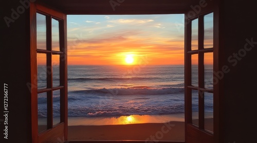 © Biancaart, Fototapeta premium Ocean Sunset Viewed From Open Wooden Window
