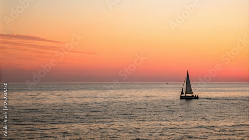 Fototapeta premium Ocean sunset with sailboat on horizon, serene landscape, warm light, blue sky