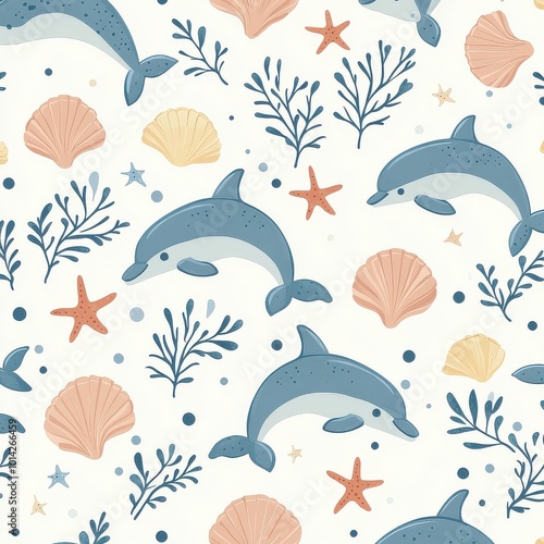 © An Amanita, Naklejka premium Ocean themed seamless with cute, adorable, pastel colored shells, seaweed, starfish and whales