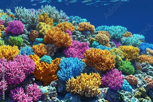 © Pawarit, Naklejka premium Ocean underwater landscape with clay coral reefs 3d background design. Generative AI , isolated on white background, , copy space, copy space for text,