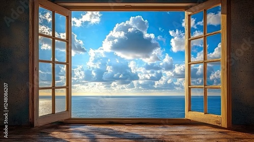 Obraz premium Ocean View Through Open Window: Serene Seascape and Cloudy Sky. A...