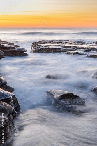 Obraz premium Ocean water flow between rocks during dawn at Coalcliff Beach, Australia.