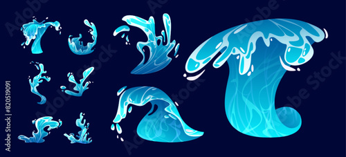 © klyaksun, Fototapeta premium Ocean water wave splash. Sea surf cartoon vector icon. Liquid drop stream summer game graphic. Isolated fluid high falling tsunami swirl vfx design. Storm motion clipart for environment illustration