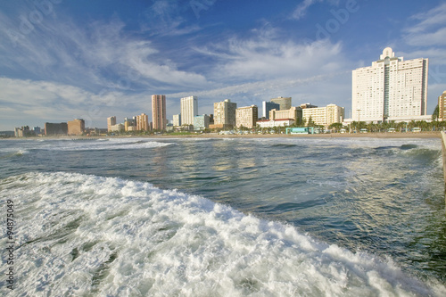 Naklejka premium Ocean wave comes in Durban skyline, South Africa on the Indian Ocean