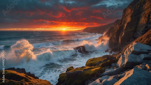 © Euis, Fototapeta premium Ocean wave crashing on rocky coast at sunset