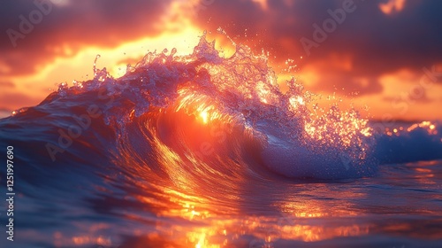© AYB, Fototapeta premium Ocean wave sunset; fiery sky, water reflections; travel, nature backdrop
