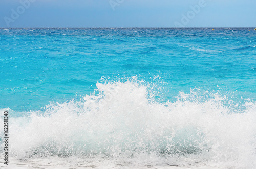 Fototapeta premium Ocean wave with splashing droplets in vibrant turquoise seawater under sunlight