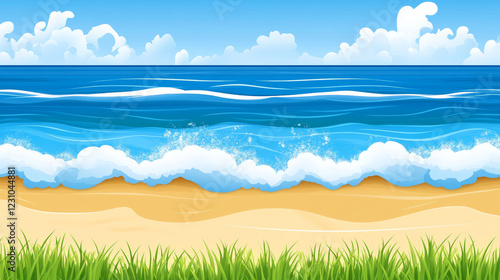 Fototapeta premium Ocean waves and sandy beach with grassy foreground
