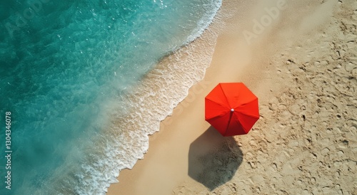 © osagvsa, Naklejka premium Ocean Waves and Sandy Shore with a Vibrant Umbrella