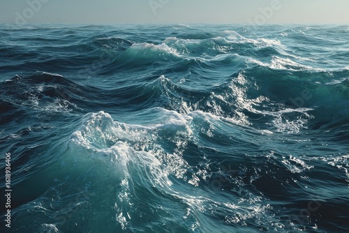 © Azadart, Fototapeta premium Ocean waves crash and churn, creating a dynamic display of teal water and white foam, driven by an unseen wind, showcasing the ocean's raw power and beauty