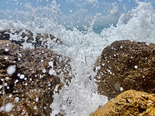 Obraz premium Ocean waves crashing against rocks on sunny day
