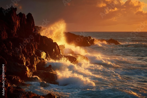 Fototapeta premium Ocean waves crashing against rocky cliffs during a vibrant sunset with an...