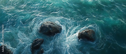 © AI Artworks, Obraz premium Ocean Waves Crashing on Dark Rocks in Turquoise Water from Above Aerial View