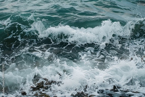 Fototapeta premium Ocean waves crashing on rocky shore with white foam.