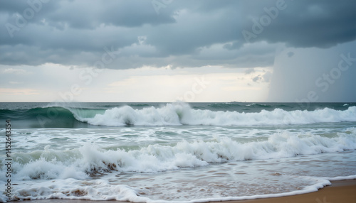 Fototapeta premium Ocean waves crashing on sandy beach under cloudy sky
