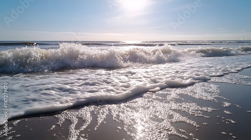 Fototapeta premium Ocean Waves Crashing on Sandy Beach Under Sunny Sky