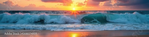 © Pat, Fototapeta premium Ocean waves crashing on sandy shore at sunset, sunset, vacation, calm