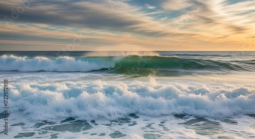 © aryo, Obraz premium Ocean Waves Crashing on Shore at Sunset with Cloudy Sky.