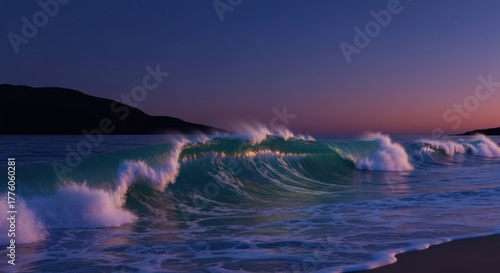 © Lestari710, Fototapeta premium Ocean waves crest at twilight, backlit by the setting sun near a sandy beach