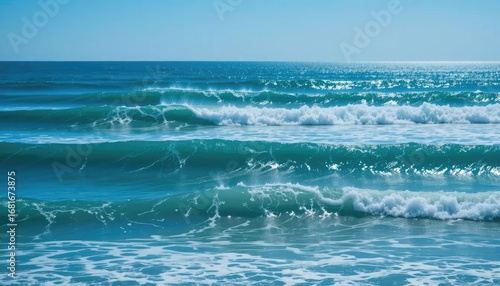 Fototapeta premium Ocean waves rolling towards the shore under a clear blue sky, creating a...