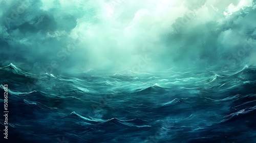 Fototapeta premium Ocean waves seascape wallpaper background with stormy weather and teal blue water surface art