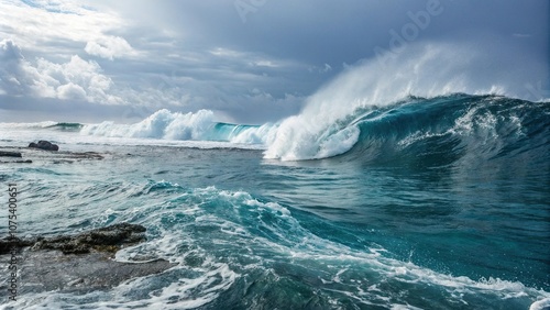 © Machita, Fototapeta premium Ocean waves with water spouting from underwater surface, water explosion, ocean spray, oceanic activity, aquatic landscape