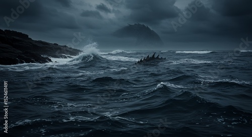 © ryandi, Obraz premium Ocean with large Wave and Spikes in Dark Stormy Weather