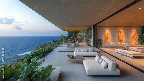 Fototapeta premium Oceanfront luxury home, modern patio, sunset view.