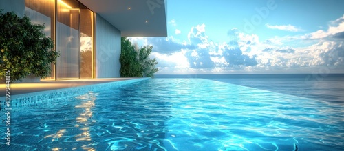 © adiba, Fototapeta premium Oceanfront luxury home pool, sunny sky