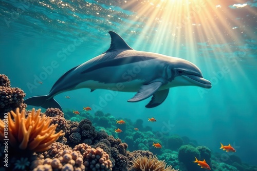 © DeeDay, Obraz premium Oceanic Dolphin Gracefully Navigating a Vibrant Coral Reef Ecosystem Under the Sun's Radiant Beams