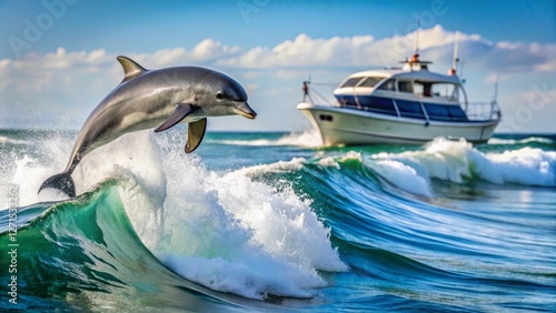 Fototapeta premium Oceanic marvel a playful dolphin leaps from a vibrant wave, a vessel gently...