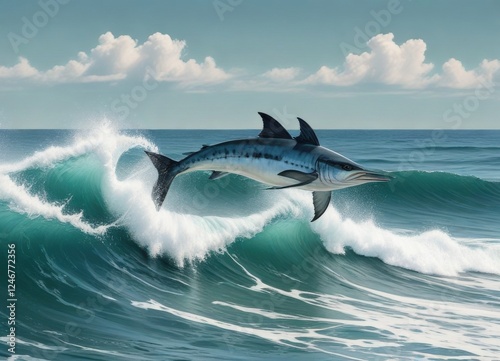 © sasiprapa, Fototapeta premium Oceanic Predator Leaping Over a Crest of a Wave in the Deep Blue Sea
