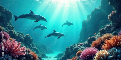Naklejka premium Oceanic Serenity Dolphins Gracefully Navigate a Vibrant Coral Reef Ecosystem