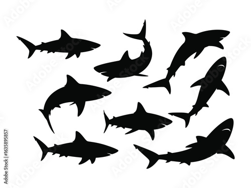 Fototapeta premium Oceanic Silhouette: A collection of majestic shark silhouettes, each a symbol...