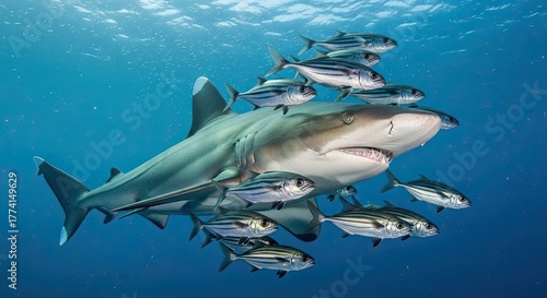 © Budi, Fototapeta premium Oceanic Whitetip Shark Swimming with Pilot Fish in Clear Blue Water.
