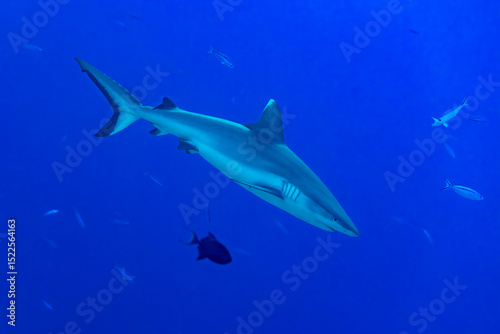 Fototapeta premium Oceanic whitetip sharks swimming in the blue waters of the Maldives.