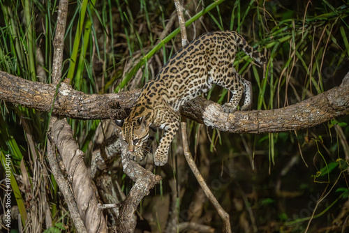 Obraz premium Ocelot climbing down from a branch