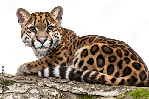 © Isra, Obraz premium Ocelot's Rest: Wild Cat on Log, Majestic Spots, Stunning Coat