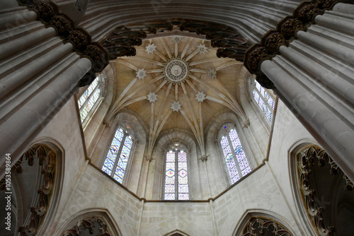© Globepouncing, Fototapeta premium Octagonal Chapel with Ribbed Vaulted Ceiling, Extreme Low Angle, Batalha Monastery, Portugal