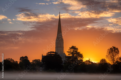 Obraz premium October misty morning sunrise behind Salisbury Cathedral from the Harnham water meadows Wilitshire south west England