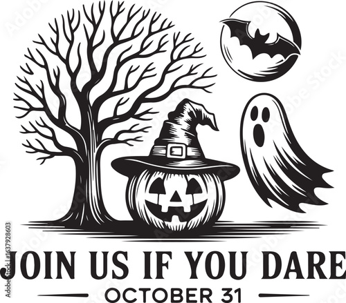 Obraz premium October 31st Vector Illustration of a Halloween Scene with Pumpkin and Ghost
