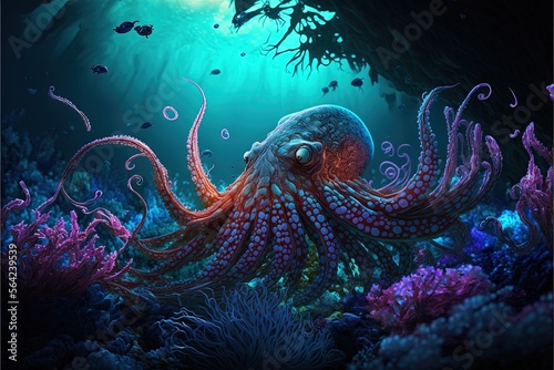 © Deivison, Fototapeta premium Octopus illustration under the ocean with corals. Generative AI