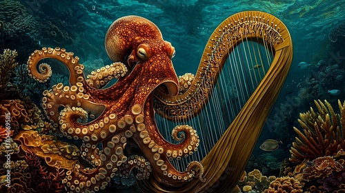 Fototapeta premium Octopus Plays Harp Underwater Reef