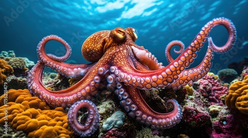 © AFFANYUDA, Obraz premium Octopus resting on coral reef underwater.
