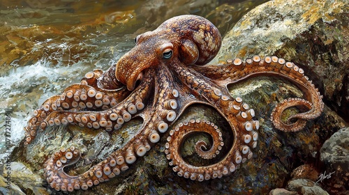 Naklejka premium Octopus Resting on Underwater Rock Formation