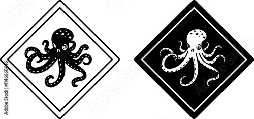 Fototapeta premium Octopus Road Signs. Black and White Vector Icons. Marine Animal Warning Road Sign. Zoo Sticker