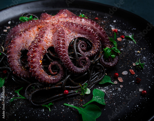 Fototapeta premium Octopus with black spaghetti, pasta, spices and herbs, top view, no people,